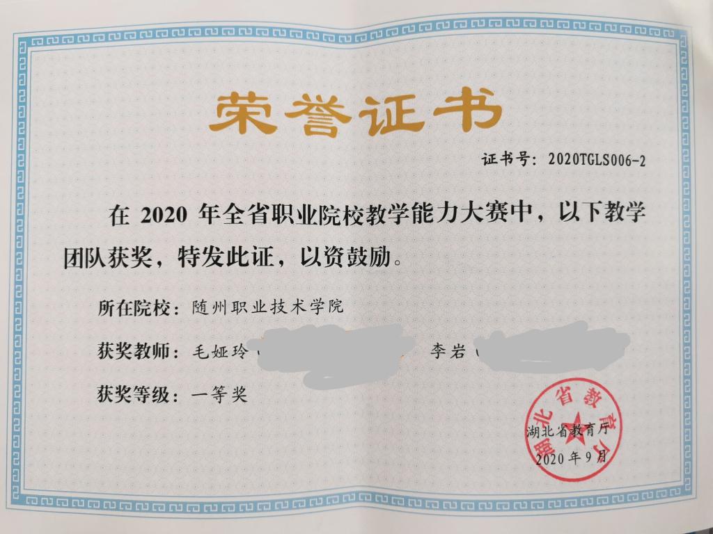 在2020年全省职业院校教学能力大赛中,护理学院毛娅玲、李岩教学团队代表随州职业技术学院首次出征,获得省赛一等奖的好成绩,刷新了我校建校以来的历史,为学校赢得了荣誉,也为护理学院增添了光彩。