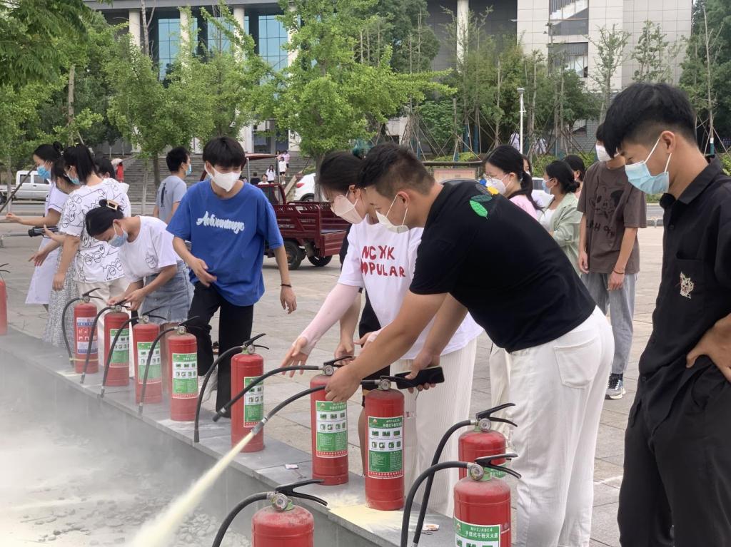 保卫处陈科长讲解演示后,护理学院实验员老师及在场的学生代表现场进行了灭火器灭火模拟练习。