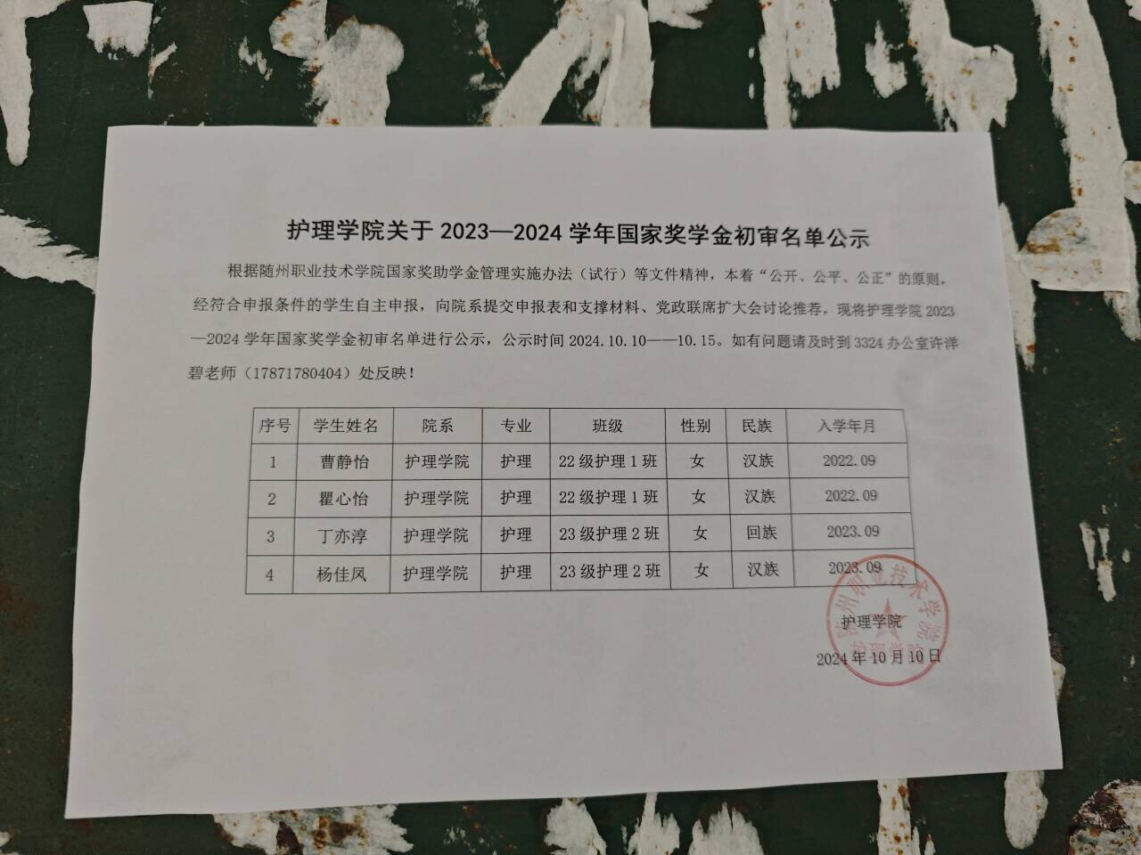 根据随州职业技术学院国家奖助学金管理实施办法(试行)等文件精神,本着“公开、公平、公正”的原则,经符合申报条件的学生自主申报,向院系提交申报表和支撑材料、党政联席扩大会讨论,现将护理学院2023—2024学年国家奖学金初审名单进行公示,公示时间2024.10.10——10.15。如有问题请及时到3324办公室许洋碧老师(17871780404)处反映!