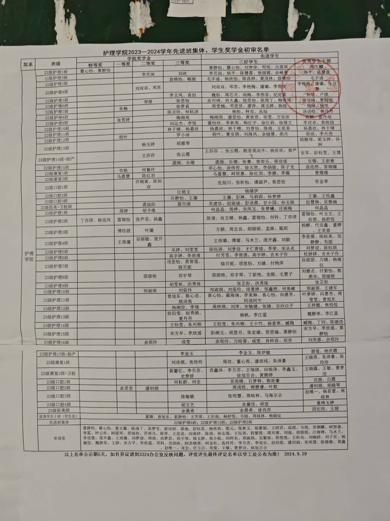 根据《随州职业技术学院学生奖励及实施办法(试行)》等文件精神,本着“公开、公平、公正”的原则,经班级评议小组讨论上报、党政联席扩大会讨论,现将2023-2024学年学生评优评先初审名单公示如下,公示时间:2024.9.29—2024.10.10,如有问题请及时到3324办公室反映!