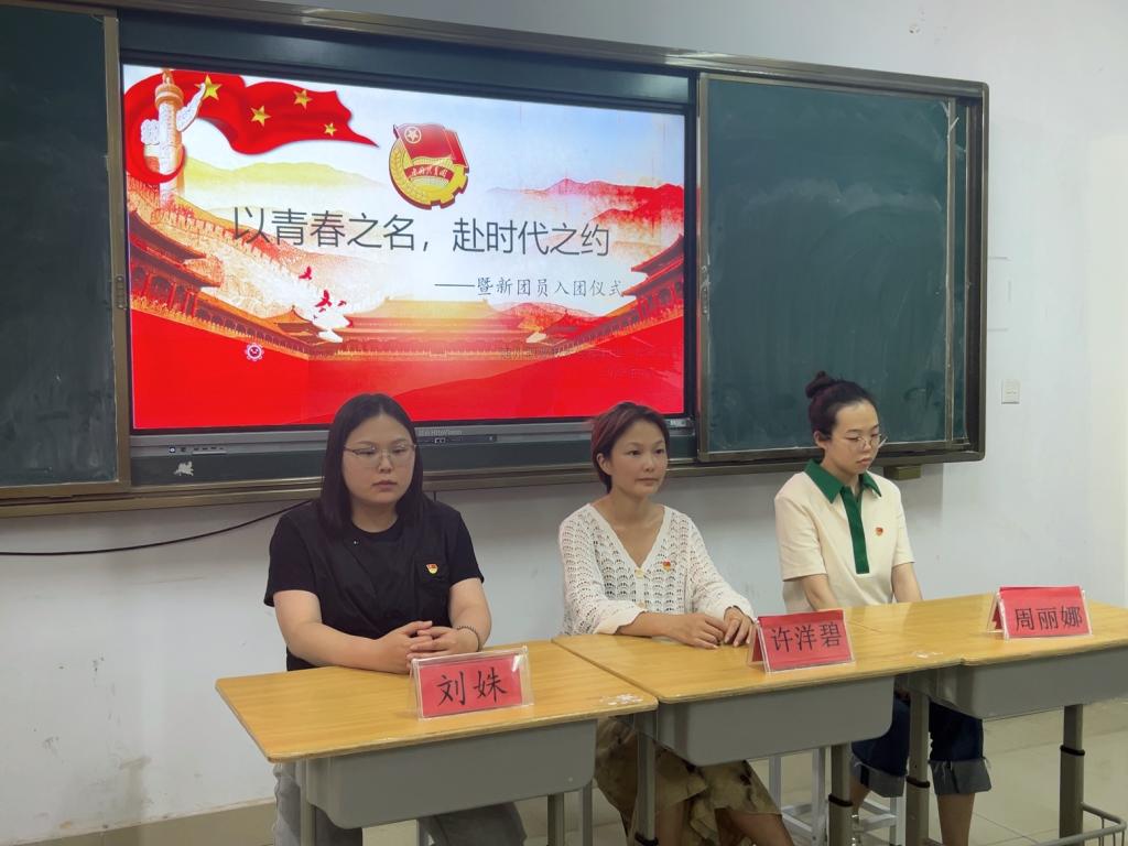 仪式在庄严的国歌声中拉开序幕,全体起立,奏响中华人民共和国国歌。齐唱国歌后,主持人宣布新团员名单,他们依次在团旗前排队,随后团总支成员为新团员发放团徽,颁发团员证,紧接着老团员带领新团员进行入团宣誓,新团员们高举右手,齐声宣读入团誓言,声音铿锵有力,似在诉说对团组织的承诺。新团员和优秀老团员代表分别上台发言。仪式的最后主持人转达了团委对新团员的期许:一是要坚定政治立场,自觉提高思想道德素质,肩负起历史使命,让自己不断成长,对全体同学起到模范带头作用;二是坚定理想信念,继续发扬五四精神,不负期望,不负重托,亦不辜负我们这个伟大的时代;三是勇于担当,争做合格的共青团员。